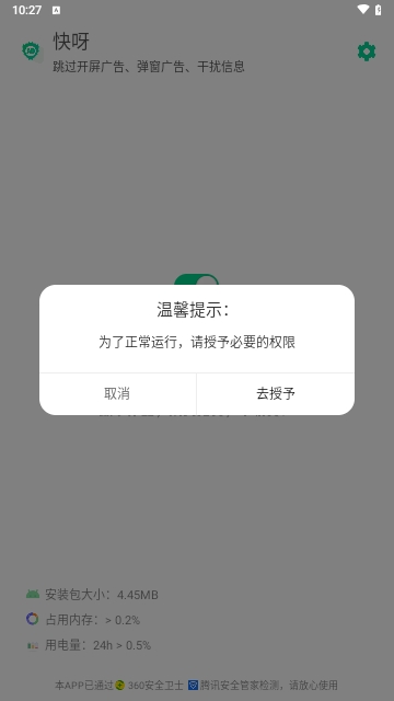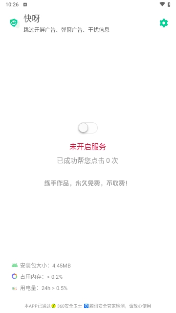 快呀跳广告APP是一款非常好用的跳广告服务工具,是专为安卓手机用户所推出的一款软件,软件内所有功能都是永久免费提供给大家使用的,没有任何的限制,上手起来非常的简单轻松,可以为大家提供一个非常清爽干净的手机使用体验,需要的话快来下载吧!