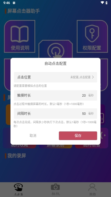 通过设置点击间隔,触摸时长点击,重复次数连点,实现自动连点器点击器。