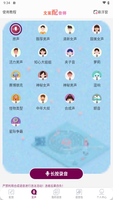 文案配音师app是由郑州宾内邮网络科技有限公司所开发准备的一款可以实时变声的手机配音软件工具,超多不同的配音声线提供给大家,可以帮助大家来轻松找到适合自己的音色配音,超多特色语音包,风格多样,轻松满足大家不同的配音使用需求。