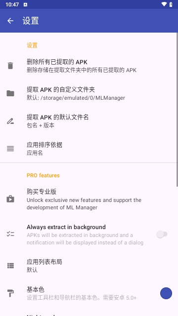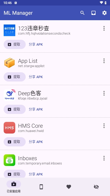 ML Manager支持中文汉化版,让大家可以来更好的来这里进行相关的使用,操作设置起来十分的简单方便,可以很好的满足大家不同的APK文件提取和分享操作,而且还支持批量处理,提取起来也会更加的高效,有兴趣的小伙伴不妨来试试看吧!