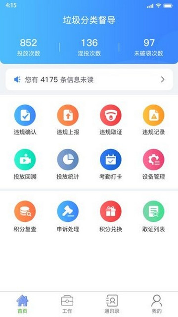 悦分类app软件可以帮助用户进行垃圾分类,适合督导员来使用,支持在手机上进行考勤打卡,对违规行为可以及时上报,能够参与违规取证,可以查看小区垃圾分类投放各个类别的投放以及质量统计。通过智能设备和数据据分析辅助监管和运营单位进行高效、精准垃圾分类。快来本站进行下载体验吧。