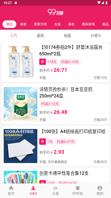 1元天天抢APP采用独家即时推荐技术,能够从淘宝、天猫、聚划算等平台精选特卖商品,实时监控价格和销量,确保用户能够以最低价格购买到心仪的商品。软件每天多次更新商品链接,涵盖女装、零食、生活用品、母婴、数码运动等多品类,满足用户的各种需求。