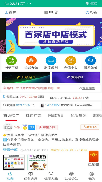 圈店app是一款可以免费发布任务的平台,平台内可以做任务,抢红包,阅读资讯等,我觉得如果没有人脉的,又想推广赚钱的小伙伴值得试试。