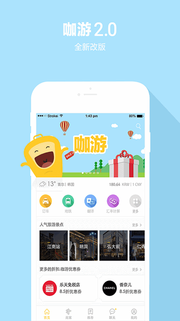 咖游韩国是为来韩旅行的中国游客提供当地旅游消费服务的专业平台。我们提供韩国吃、喝、玩、购全方位的海量优惠券及精选商家信息,并且提供机场接送专车预订、韩语在线翻译、实时汇率、当地人推荐美食及购物攻略、天气预报、旅行移动客服等韩国自由行必备服务,让来韩游客购物旅行更省钱、更便利、更开心。