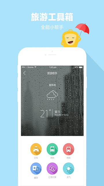 提供韩国旅游全面的准备信息,其中涵盖韩国天气预报、韩国汇率,让你轻松做好旅游前准备;翻译内容包括韩国购物、韩国吃饭、韩国交通、韩国住宿等旅行必要的韩国日常用语;APP内旅游客服,实时为你解答韩国旅游难题