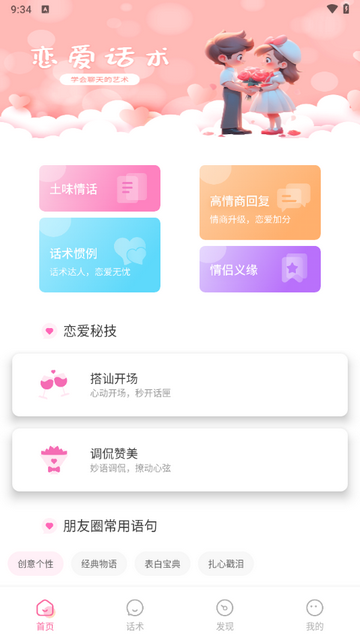 3、将恋爱话术按场景、功能分类展示,并根据用户使用习惯推荐热门内容,提升查找效率。