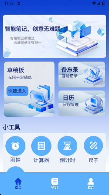 1、下载并打开penda笔记APP,就能看到诸多实用工具,并能便捷记事;