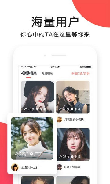 视你是一款集相亲,交友,恋爱,社交于一身的App,通过实时视频互动解决陌生人社交破冰的真实相亲社交产品。以视频,语音,文字等多种方式,多场景的为上千万用户创造更多恋爱机会!在视你每天都可以亲眼见证很多人的牵手幸福,也许你也是其中的一员~找对象用视你,对象就是你。