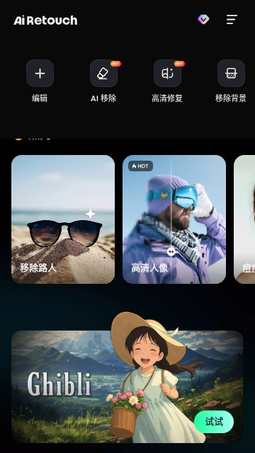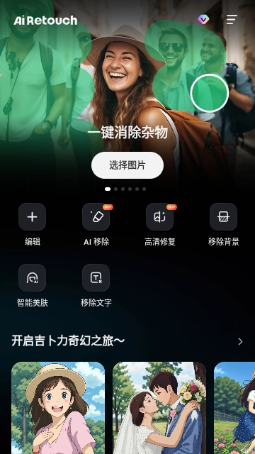 AI Retouch移除杂物是一款功能强大的AI驱动的图片编辑应用,旨在助力用户便捷地消除照片中的多余元素。该应用集多种实用功能于一身,操作界面简洁明了,无需繁琐的注册登录步骤,即可立即上手使用,帮助你轻松快速的去完成修图。