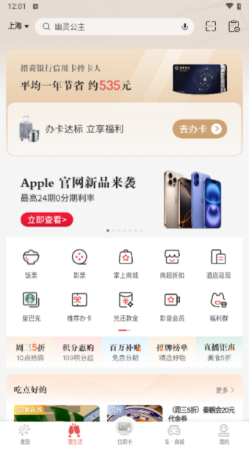 【生活】吃喝玩乐必备神器:聚合饭票、影票、小招喵品牌馆、积分礼遇、高端专享和天天福利等板块,新增掌上管家和领券中心。掌上生活运动,支持接入健康数据,可通过“体育健身”与好友一较高下,一起健康运动及互动。吃喝玩乐一网打尽,福利优惠一手掌握。