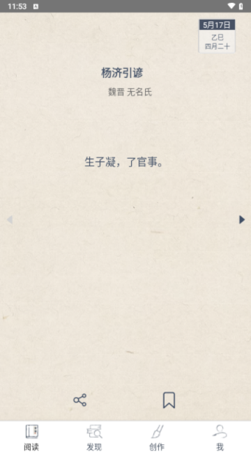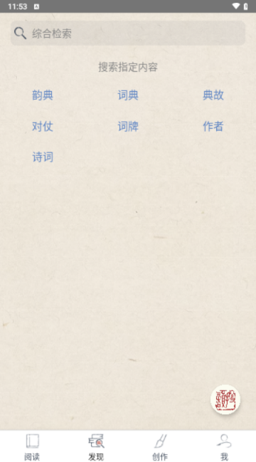 3、搜韵app将网站上部分核心功能整合为阅读、查询与创作几个板块,首页还有诗词天气预报