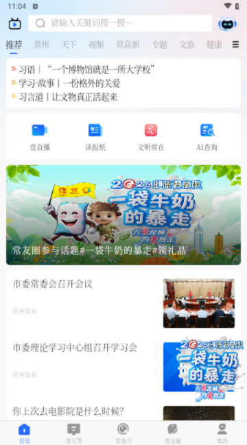 3、看电视、读报纸、追直播、听广播,这里一触即达。设有“常州”“天下”“专题”等权威资讯频道,聚焦本地中心工作,观察社会多面,通过智能推荐与人工筛选,提供深度报道、短视频、直播等内容,同步推出AI主播“小观同学”,实现语音交互与实时问答。