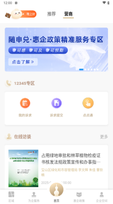“营商互动”频道定位“生态服务”,为各区各部门的旗舰店提供本区、本部门相关涉企特色服务的入口,同时支持企业法人用户进行关注、点赞、分享,打造本市营商环境优化的移动政务服务生态圈;为用户提供与政府“对话”的相关互动服务,如找茬、云调研等服务。