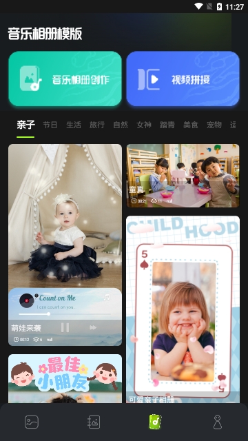 软件里面的音乐相册模板有详细分类,包括亲子、节日、旅行等。