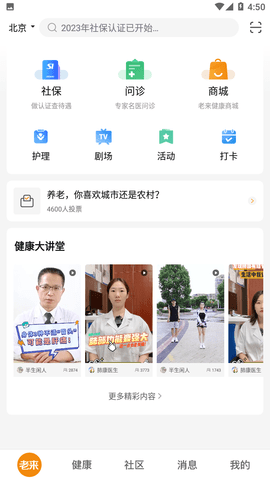 老来app,原名老来网app,现已进行更新改名,这是一款专门为中老年人提供的生活实用类手机软件,在这里不仅为用户们提供了社保人脸认证、医保、保险等方面的公共服务,还提供了打卡赚钱、视频直播、走路赚钱等生活服务,致力为中老年人提供一个更好的互联网+康养服务平台。