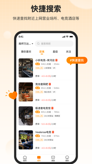 【快捷搜索】快速定位附近上网营业场所、电竞酒店,一键导航 更多好玩功能等你来体验哟!