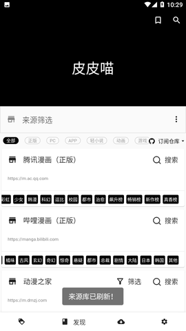 皮皮喵App是一款内置了超多漫画搜索源的漫画观看软件,超多动漫在这里都能找到,而且这些漫画画质也都是非常清晰的,没有任何的水印,阅读观看体验也是十分的舒适,大家可以随意的来下载缓存观看,超多资源任你选择。