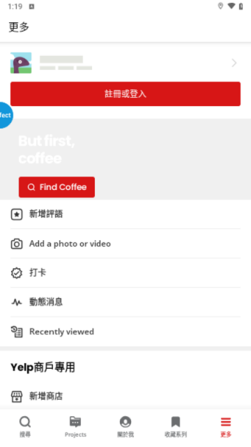 1、打开app默认进入到“搜寻”板块,点击切换到【更多】页面,找到Yelp商户专用中的“新增商店”。