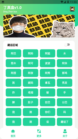 1、众多恶搞元素的小盒子。对应的字点一下就可以让丁真发出对应的声音,非常有趣!软件完全免费,也没有广告放心玩