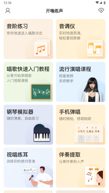 开嗓练声App是专为学习声乐的用户提供音阶训练、实时检测音高、声乐教学、视唱练耳的实用软件。
