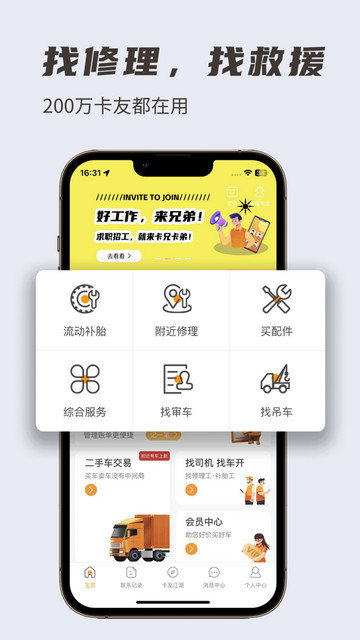 卡兄卡弟app是一款专门为现代公路物流行业而打造的综合性服务软件,该软件为用户提供了实时定位寻找修理、补胎、购买配件、移动加油等功能,行车途中通过实时定位寻找修理、补胎、购买配件、移动加油、让行车不再难,提前发布审车信息,专人代审驾驶员不再劳累,车主不再休车等审。同时用户还能通过卡兄卡弟救援中心发布招聘信息,二手车买卖信息,车主寻找驾驶员更容易,驾驶员找工作不再难,从此二手车买卖更划算。以此来帮助用户行车不再担心遇到问题,给所有的交通运输参与者提供极为优质的服务。