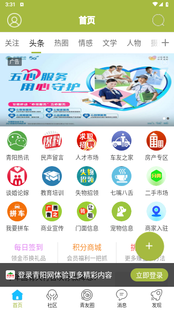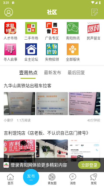 青阳网app能够参加互动交流探讨,共享自身身旁的新鲜事儿,和各位一起快乐沟通交流。软件功能非常强大,内容涵盖民生、汽车、美食、休闲、购物、招聘等生活消费信息,还有房产、家居、亲子、旅游等二十多个板块,满足用户们不同需求,快来下载吧。