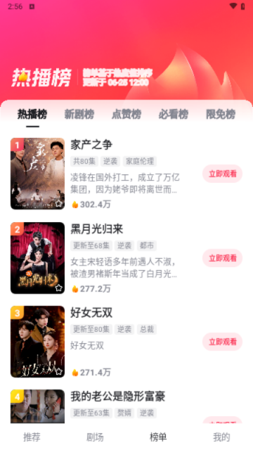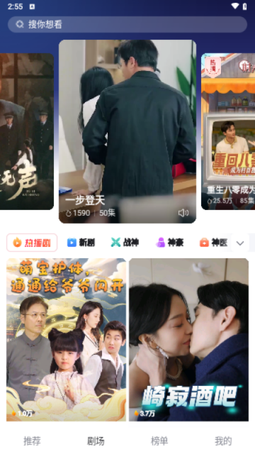 该APP还设有“剧场”板块,用户可以轻松查看热播剧、新剧等内容,并通过搜索功能精确查找所需短剧。此外,平台内还有专门的短剧榜单,包括热播榜、新剧榜、点赞榜、必看榜和限免榜等。比如,热播榜按照热度值进行排序,每日中午12点更新一次,这样用户能随时掌握最受欢迎的短剧。