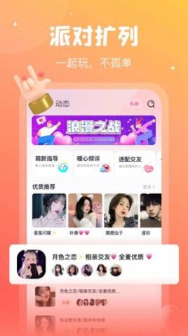 这是一款很不错的交友软件,里面有很多高质量的单身用户,大家可以轻松的结识,找到自己喜欢的朋友,还可以一键开启视频聊天模式,更好的了解对方的兴趣爱好,让你可以轻松的脱单,这里还有各种社交游戏,能够让你们之间的感情更深一些,感兴趣的小伙伴们赶快下载试试看吧。