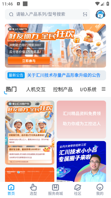 掌上汇川是一款专注于工业产品选型和信息服务的软件。它通过简洁的操作界面,帮助用户快速选择和对比各类产品,适合需要选择工业设备或配件的用户。除了常规的选型功能,掌上汇川还提供了丰富的产品资料、视频讲解以及互动社区,支持用户随时随地获取行业动态、学习新知识,并与同行交流。