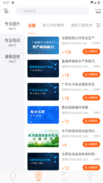 2、选择你希望学习的课程,点击”加入购物车“。另外课程的排序可以根据学时或者价格来排序。学时和价格的排序都可以选择从高到底,或者从低到高。