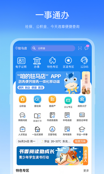 咱的驻马店app安卓版是一款为当地市民打造的生活服务软件,为本地区居民带来了极大便利,为广大市民提供了全面且专业的生活服务功能,包括了政务服务、公共服务、便民服务等等,感兴趣的小伙伴体验一下吧!
