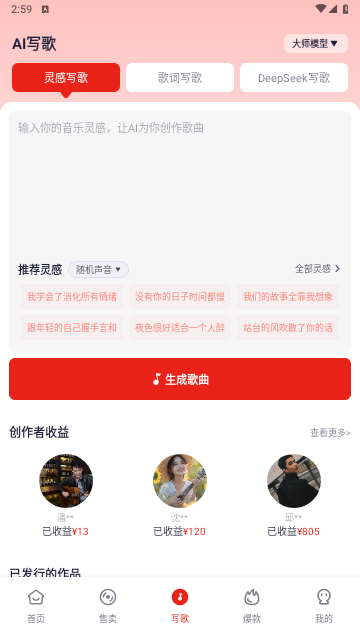 【AI写歌】包括:灵感写歌(一句灵感生成专属音乐)、歌词写歌(输入歌词自动谱曲)、DeepSeek写歌(深度定制个性化歌曲)、爆款写歌(一键生成热门同款旋律),满足从新手到专业的不同创作需求。