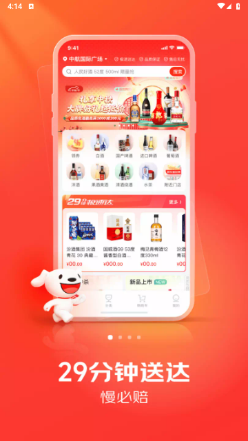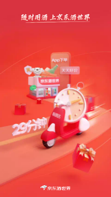 1. 29分钟送达,慢必赔:在京东酒世界下单,附近门店即刻配送,29分钟内极速送达,慢必赔(门店配货范围内,超出极速达订单配送时效,可按规则赔付)。