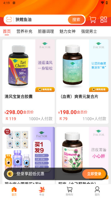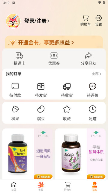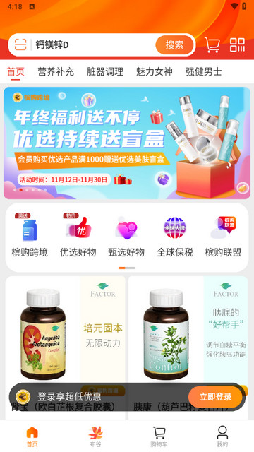 1、下载并打开槟购跨境app,用户可以选择保健商品类型。
