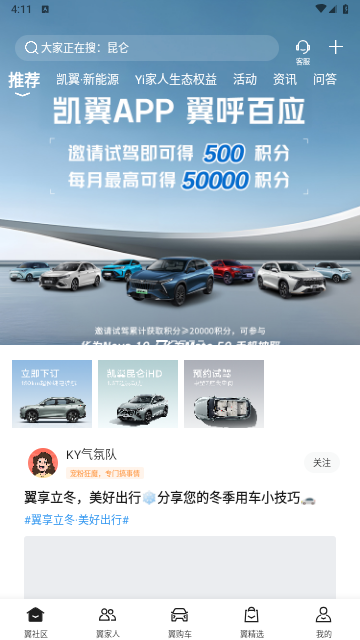 凯翼汽车APP是专为用户打造的专属平台,致力于为用户提供更优质的服务和全新的数字化用车体验,为广大用户创造美好的出行生活。在这里,您可以畅享更愉悦的社区生活,更贴心的用车服务,更智能的凯翼出行。