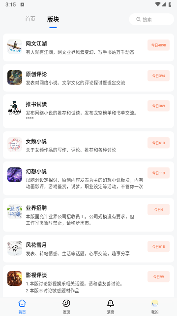 发布对网络小说的书单、推荐、试读、刷榜,是读者交流小说阅读体验的版块