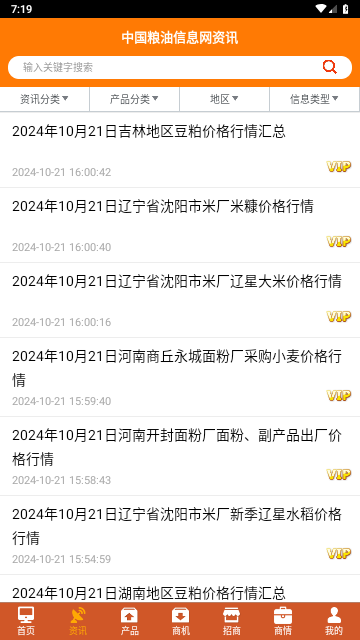 2、在资讯界面中,这里会实时更新各种粮油品种的最新资讯,用户也可以按照咨询分类、地区、产品分类和信息类型去进行筛选查找阅读