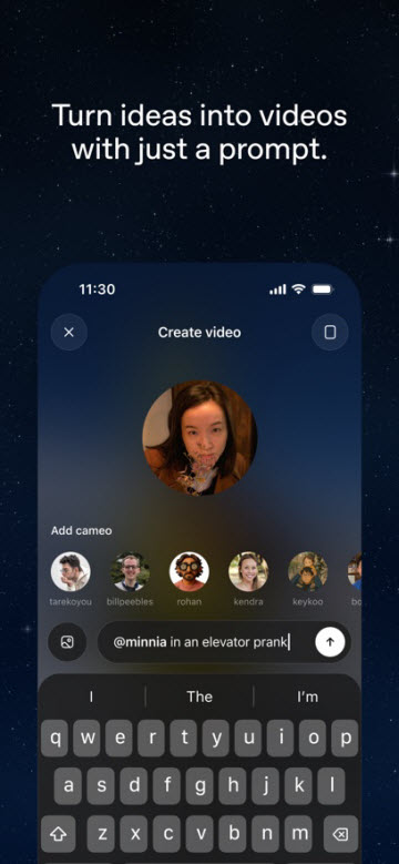 Sora App提供了Cameos这项角色客串功能,用户可在日常生活打造想要的客串角色,例如宠物、涂鸦、物品,或在Sora App打造原创角色。这些角色可以存储在用户设备,在未来的AI视频重复使用,也能分享给其他用户使用。